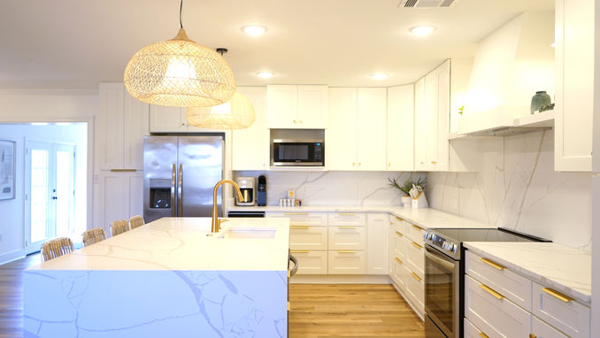 This kitchen was designed to entertain with spacious quartz countertops and backsplash, a two sided waterfall edge island with seating for 4 and oversized bamboo pendants for ambient lighting. The dining table seats 6 people. Your coffee/tea needs are covered with both a Keurig, a 14-cup coffee maker and tea kettle. Appliances include a 4-slice toaster, Instapot, crockpot, Ninja air fryer, sweet tea maker and blender. Pots and pans are ceramic, pfas free. Wilton baking sheets and pans for cookies, brownies and more are also pfas free. Platters, bowls, cutting boards and pitcher are also stocked in the kitchen.